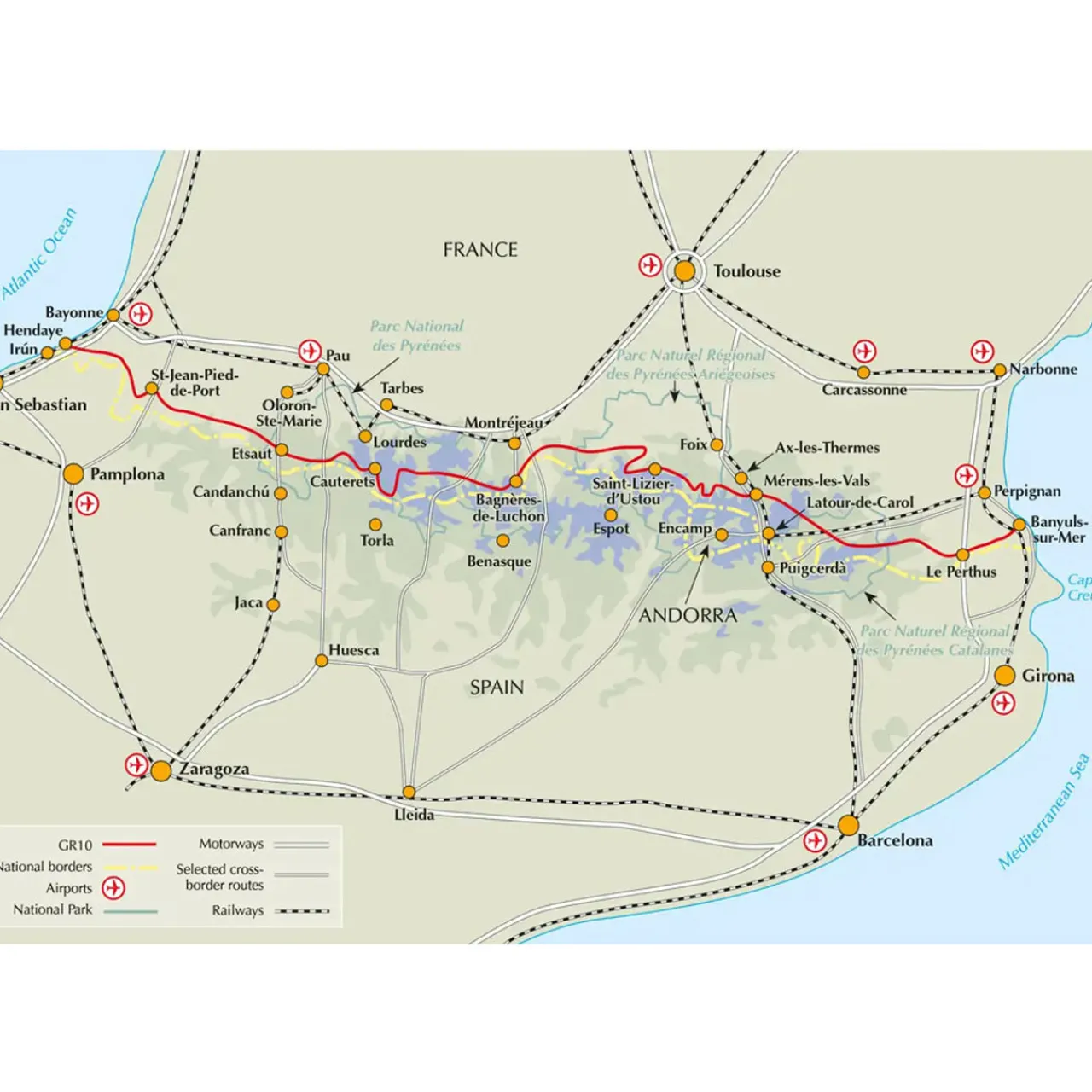 A guidebook to walking the GR10 Sentier des Pyrenees trail between Hendaye on the Atlantic coast and Banyuls-sur-Mer on the Mediterranean. Covering 954km (593 miles), this long-distance trail through the French Pyrenees takes around 7 weeks to walk and is suitable for hikers with some long-distance trekking experience. The route is described from west to east in 55 stages, each between 7 and 27km (4–17 miles) in length. Bad weather alternatives have also been included.