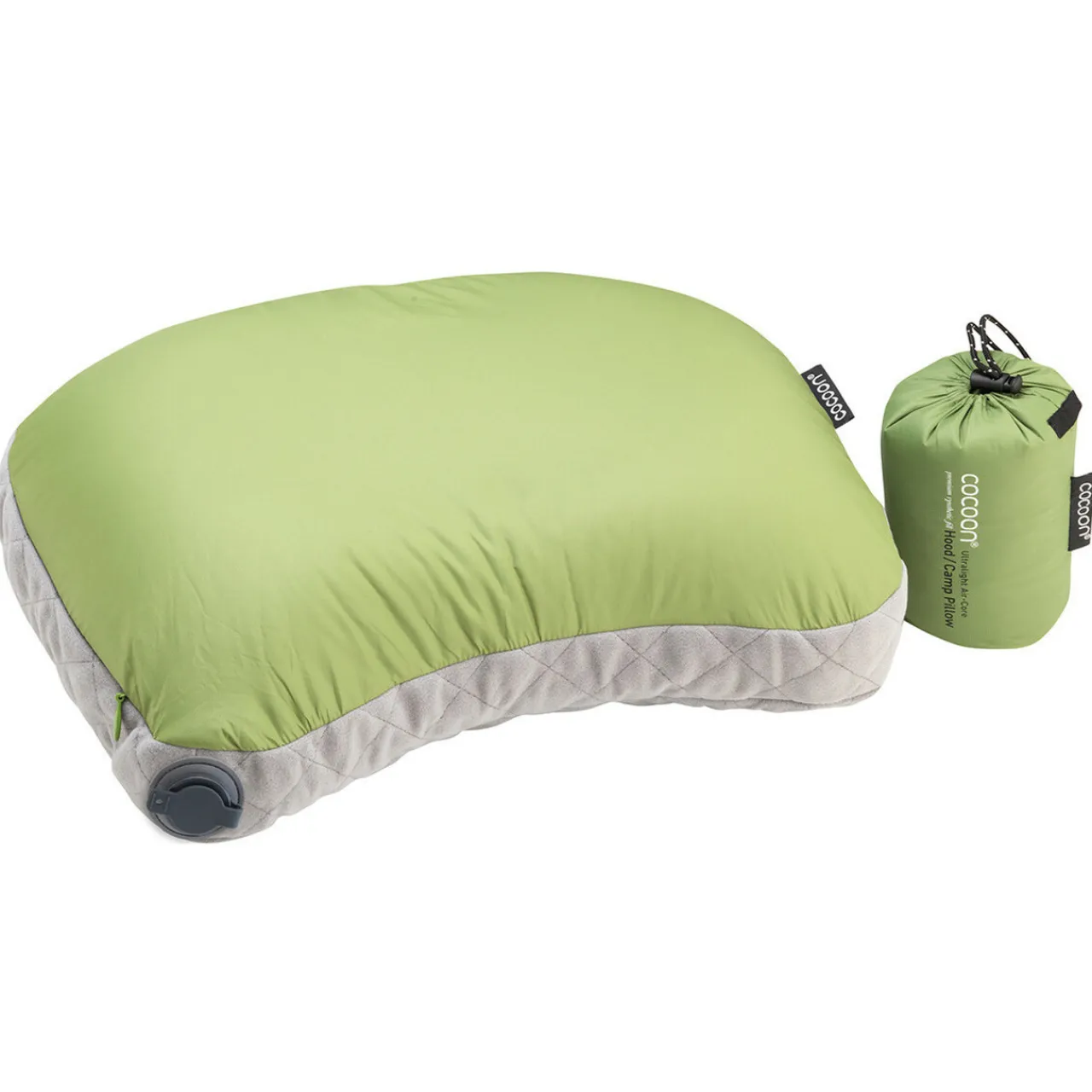Ultra-lightweight, compact travel pillow with an inflatable, exchangable air core underneath a layer of synthetic filling and a Microfiber/Nylon shell. The Air-Core Hood/Camp Pillow is specially designed to fit in the hood of a sleeping bag. Its shape also makes it ideal for use in a hammock.
