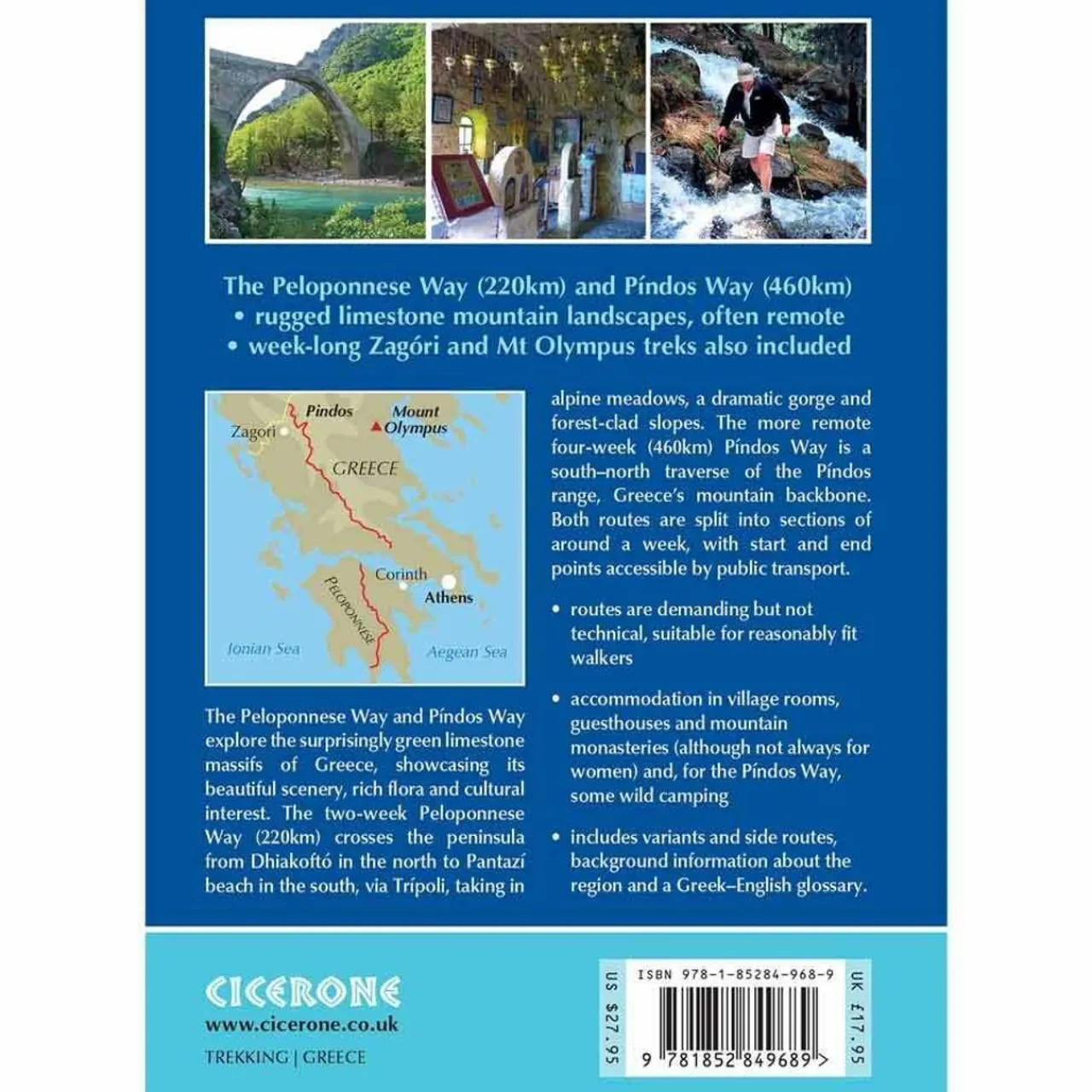 This guidebook presents four specially devised treks in the mountains of Greece, showcasing its beautiful scenery, rich flora and cultural interest. The Peloponnese Way crosses the Peloponnese peninsula from Dhiakoftó in the north to Pantazí beach in the south, via Trípoli. Taking in alpine meadows, a dramatic gorge and forest-clad slopes, the 220km route can be walked in around a fortnight. The 460km Pindos Way is a south-north traverse of Greece’s mountain backbone, and can be walked in a month, or split into sections of around a week. With remote terrain, navigational challenge and fewer facilities on route, it is the toughest of the four treks but offers a unique chance to experience both the country’s wilderness and traditional mountain life. A shorter 80km Zagóri trek can be enjoyed in its own right or incorporated into the Pindos Way, and the final route explores Mt Olympus, home of the ancient gods of Greek myth and the highest mountain in Greece. With clear mapping alongside detailed route description for each stage of the treks, as well as background information about the region and a Greek-English glossary