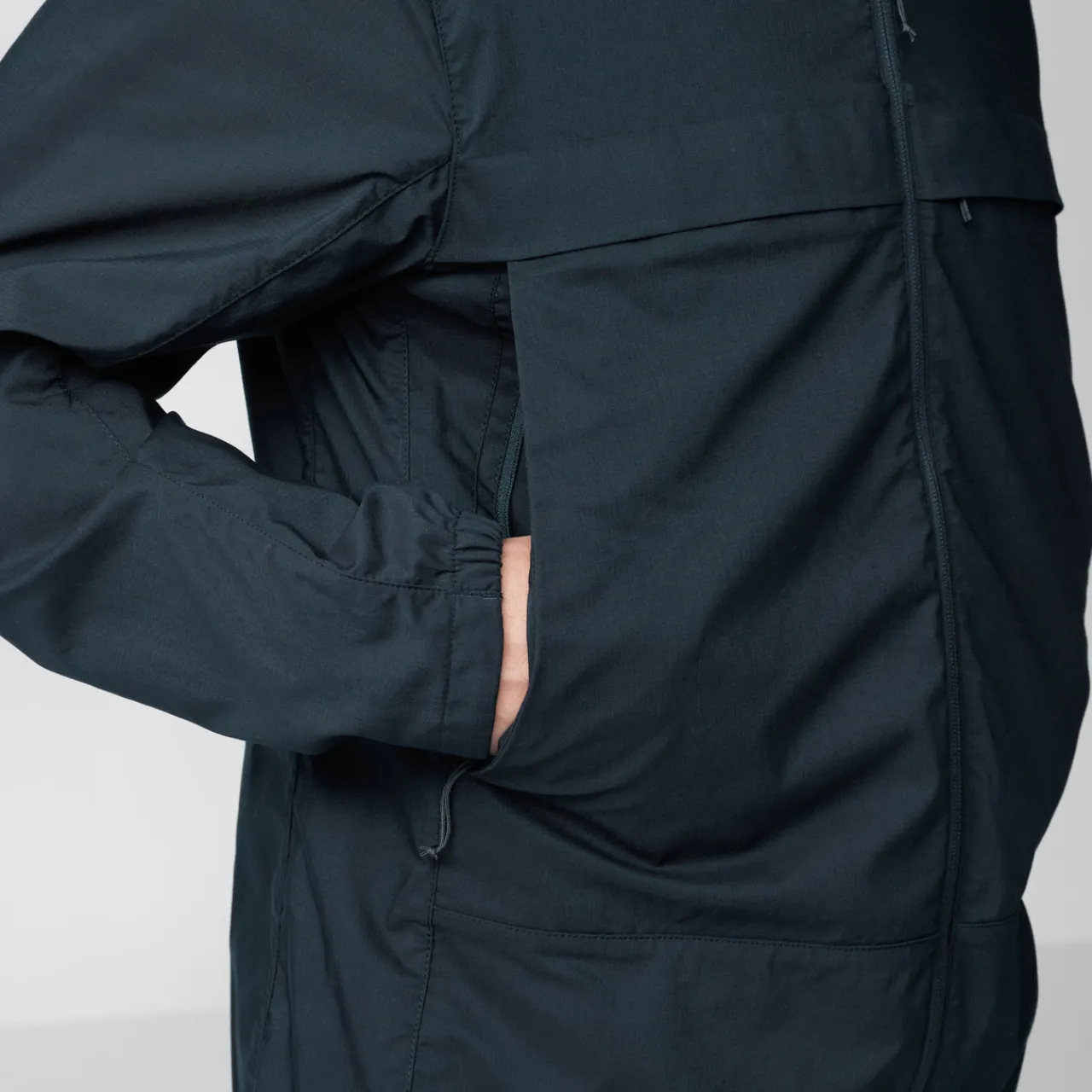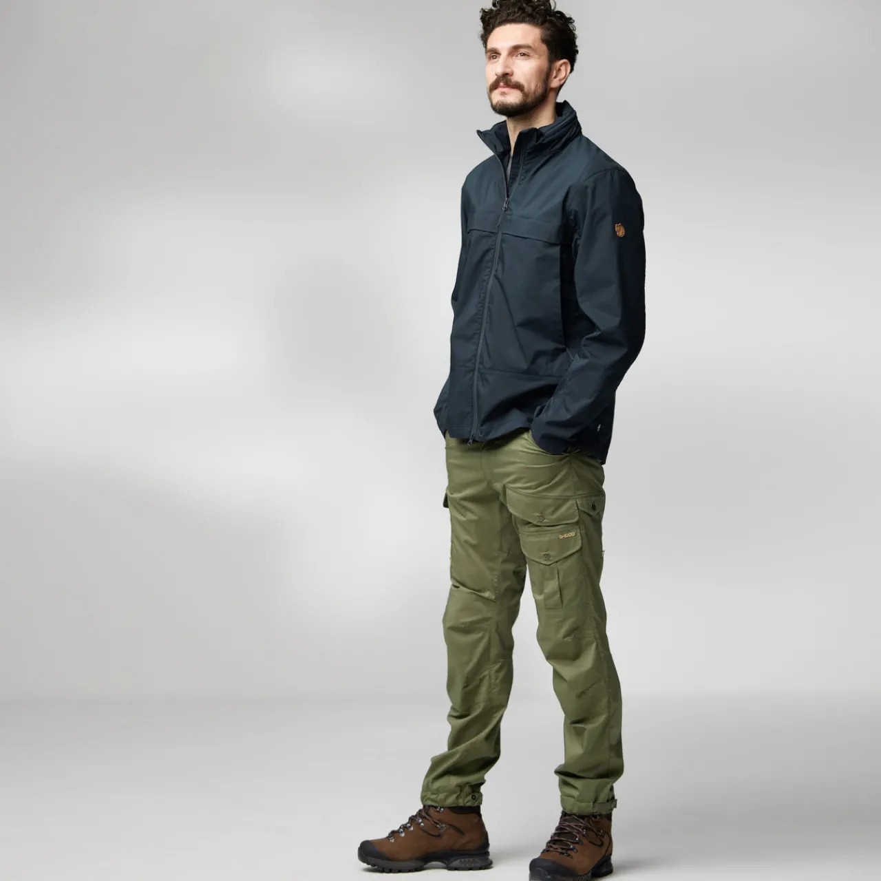 Light, comfortable and packable jacket for hiking and travelling in warm climates – Abisko Hike Jacket M has properties perfect for travelling and hiking in warm climates: Breathability, comfort, and quick-drying, made in G-1000 Air Stretch with recycled polyester and organic cotton. This hiking jacket is packable in its own pocket, lightweight, and easy to store when not used. The adjustable hood can be rolled up and stowed in the collar. Two zippered hand pockets, two top- loaded pockets, one zippered and one with a welt pocket opening, drawcord adjustment at the hem, and elastic edging at cuffs.