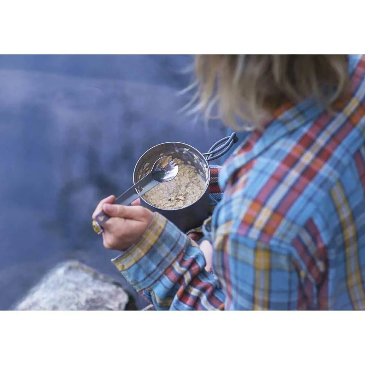 Both the spatula and spork make perfectly useful outdoor cooking utensils on their own as well. The spatula features a chamfered edge for easy scooping, as well as a serrated corner for cutting into and checking on food while it is still cooking. The long spork is perfect for getting into deep food packets and can be used as both an eating and serving utensil.