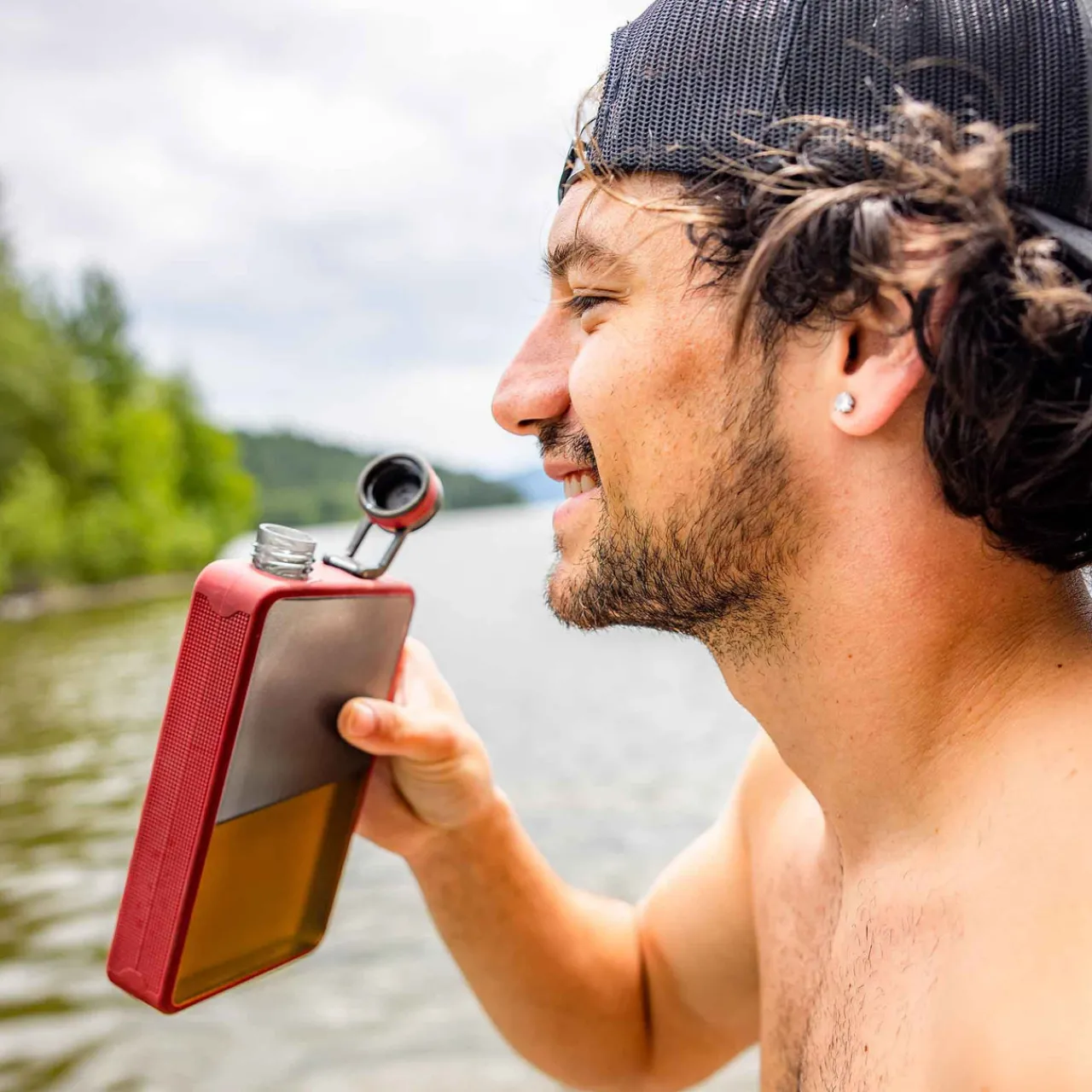 Lightweight, ruggedized hip flask. Your favourite beverage can now go anywhere in the Boulder Flask. Includes graduations for measuring and can take any fall with the sleek bumper flask.