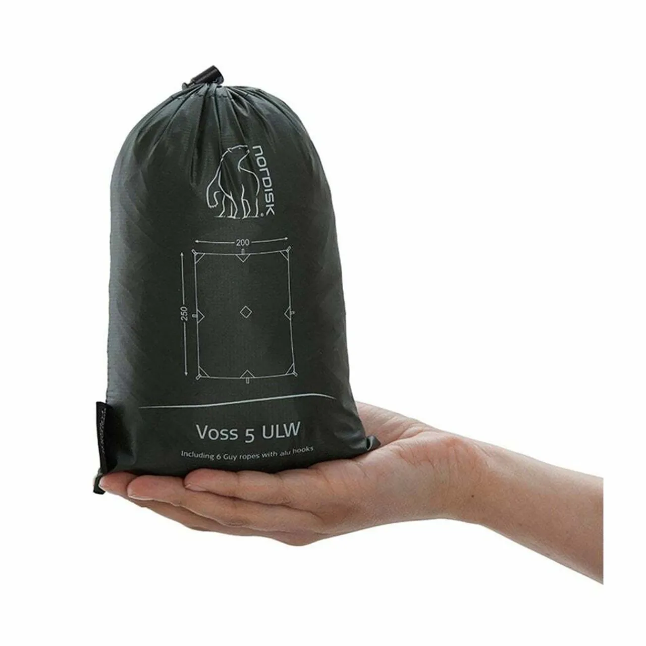 Voss 5 ULW tarp is one of the world’s lightest portable shelters. Although the flysheet weight is only 170 grams, no compromises have been made in regards to functionality. It has a total of 8 attachment points; one at each corner, one centered on each edge, Voss 5 ULW comes with 6 removable guy lines, complete with guy line sliders and aluminium Nordisk hooks for fast and easy setup. All together, the Voss 5 ULW can selectively be used at a race weight of 170g or with 2 guy lines at 190g or fully equipped has a total weight of only 240 grams and an absolute minimal pack size.