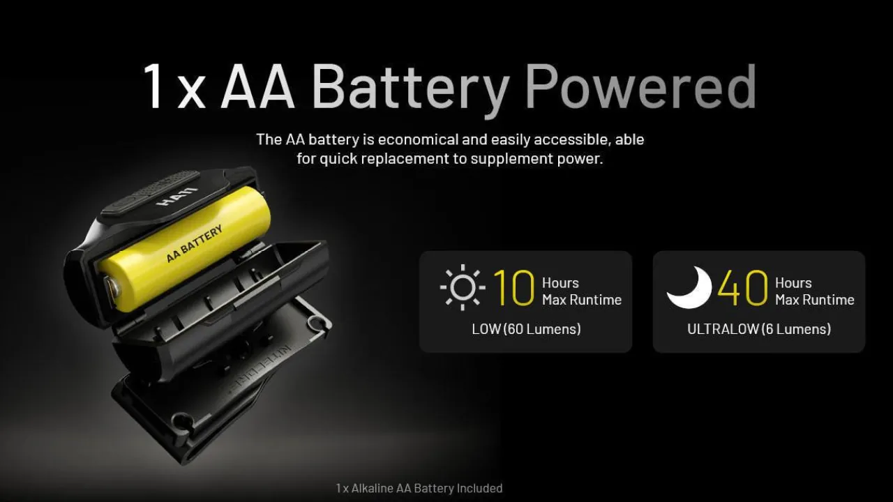 The Nitecore HA11 headlamp has a maximum output of 240 lumens from the white LED and is powered by a single AA battery. The light utilises a unibody optical lens system with various facets, achieving excellent performance in a compact size.
