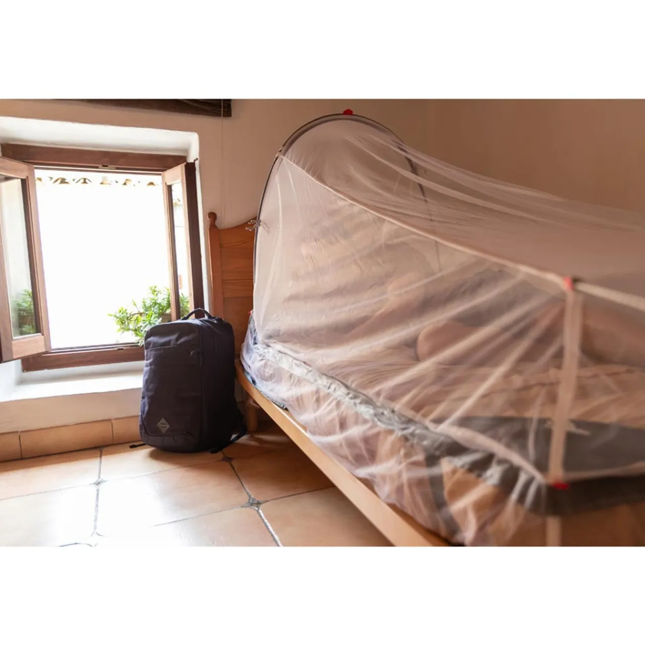 Freestanding mosquito net that uses an aluminium pole to create internal space for those times when there’s nothing to hang your net from.