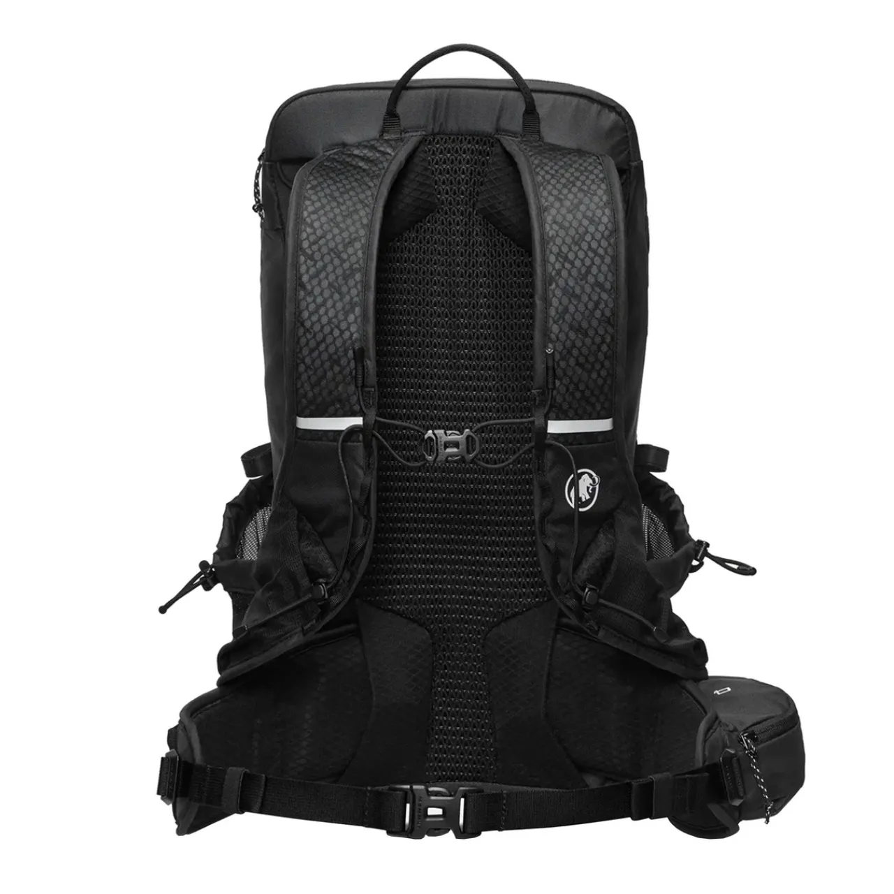 Storage is simple but smart. A large front stretch pocket easily accommodates wet layers or bulkier items, and the side mesh pockets are just the right size for bottles or trail food. The hip belt has a single secure pocket, and there’s a stash spot up front with a key clip. I’m always glad to see proper shoulder strap pockets — ideal for soft flasks, a phone, or a bar, all within easy reach. The included rain cover is neatly integrated and easy to deploy when needed.
