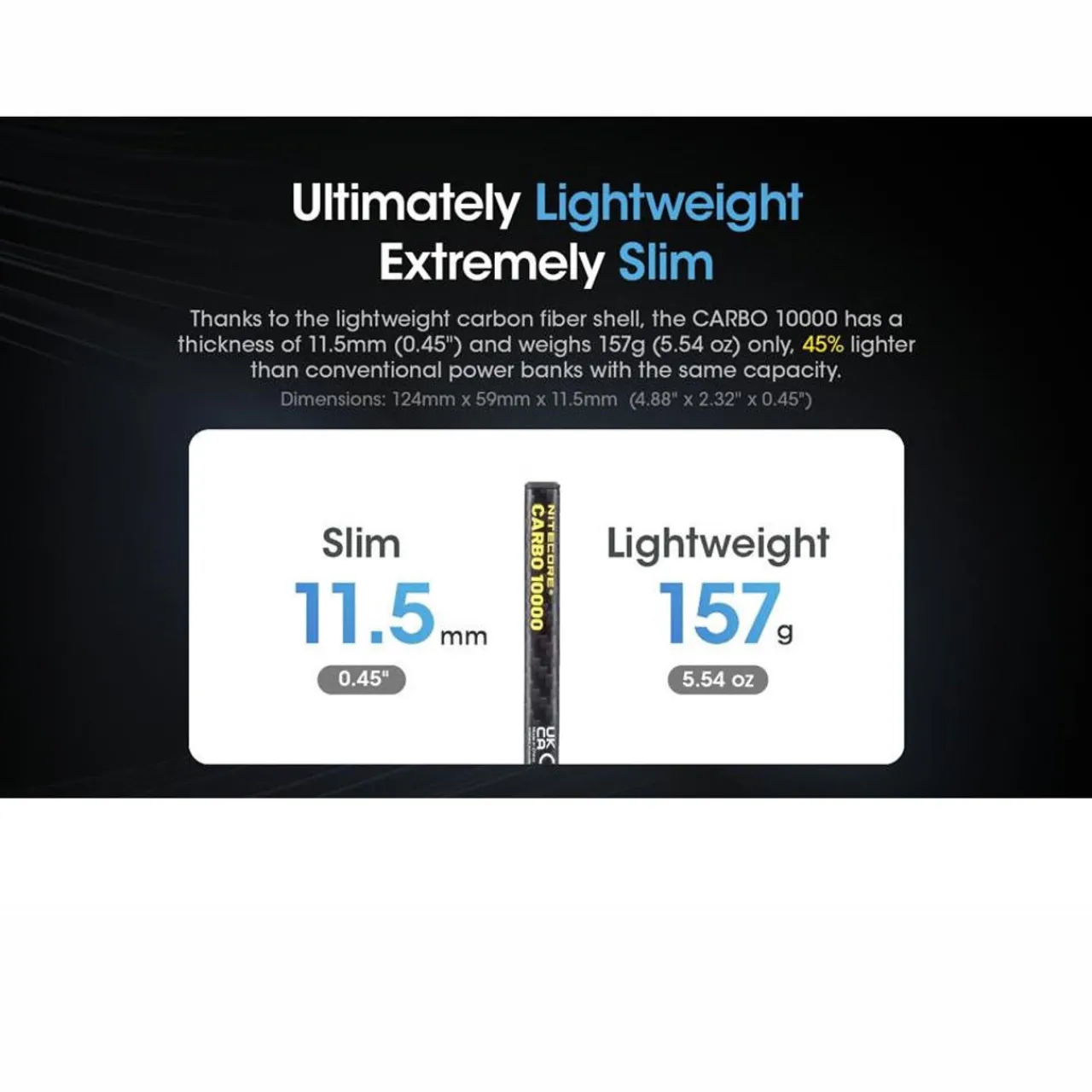 The Nitecore Carbo 10000 is an ultra-portable and well-built power bank perfect for life on the go. Weighing just 157g, its carbon fibre body is incredibly lightweight yet extremely durable and resistant to scratches and corrosion.