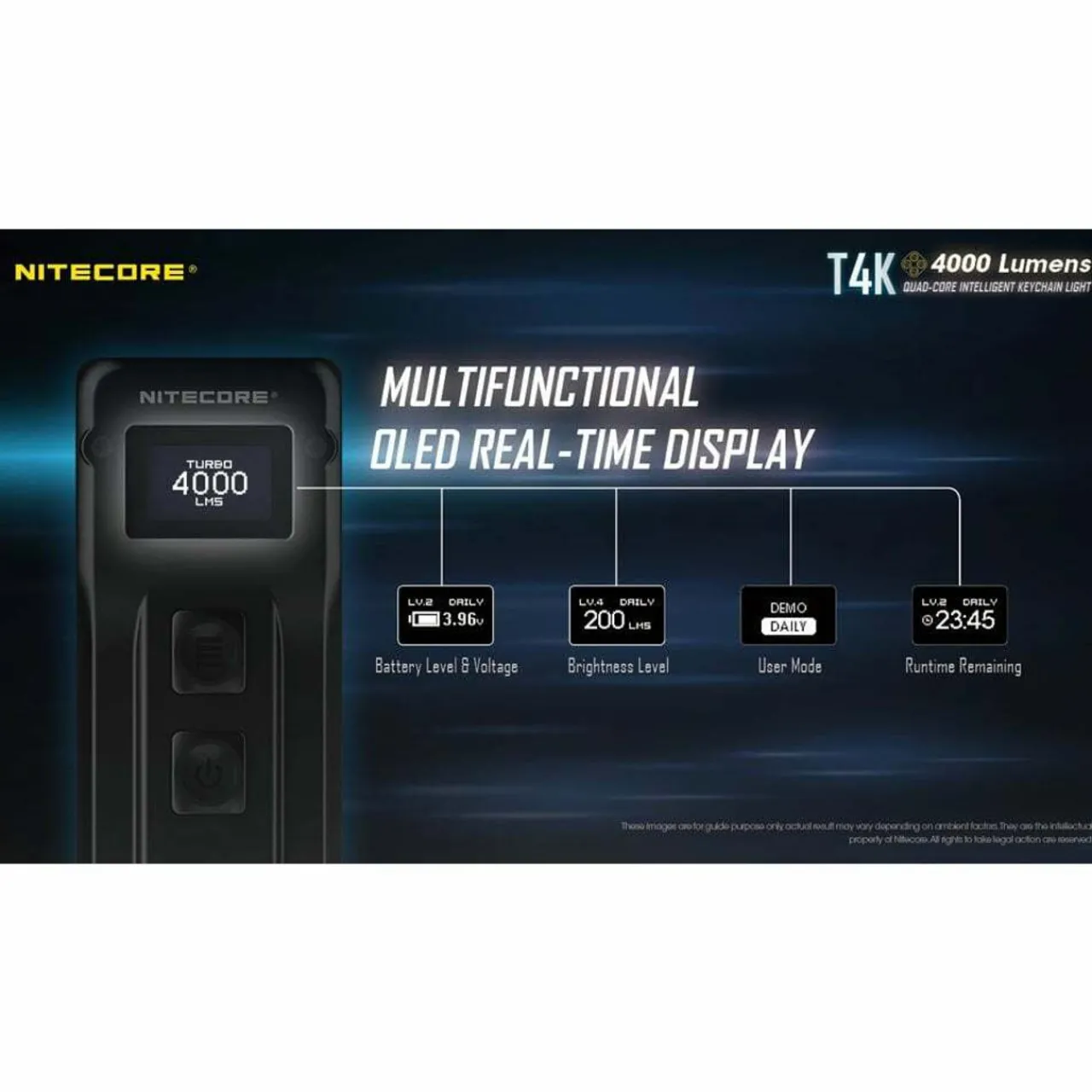 The Nitecore T4K keyring light has an incredible maximum output of 4000 lumens from the 4 x Cree XP-L2 V6 LEDs and is powered by a built-in, 1000mAh li-ion battery. The flashlight is rechargeable via a USB-C port at the base of the torch and comes with a USB-C to USB charging cable.