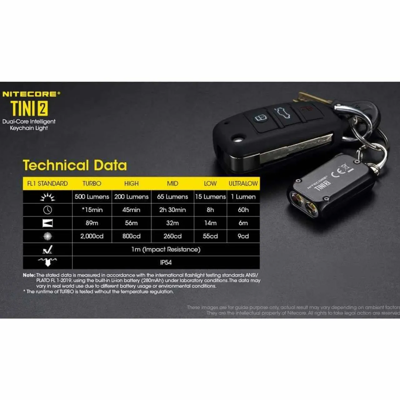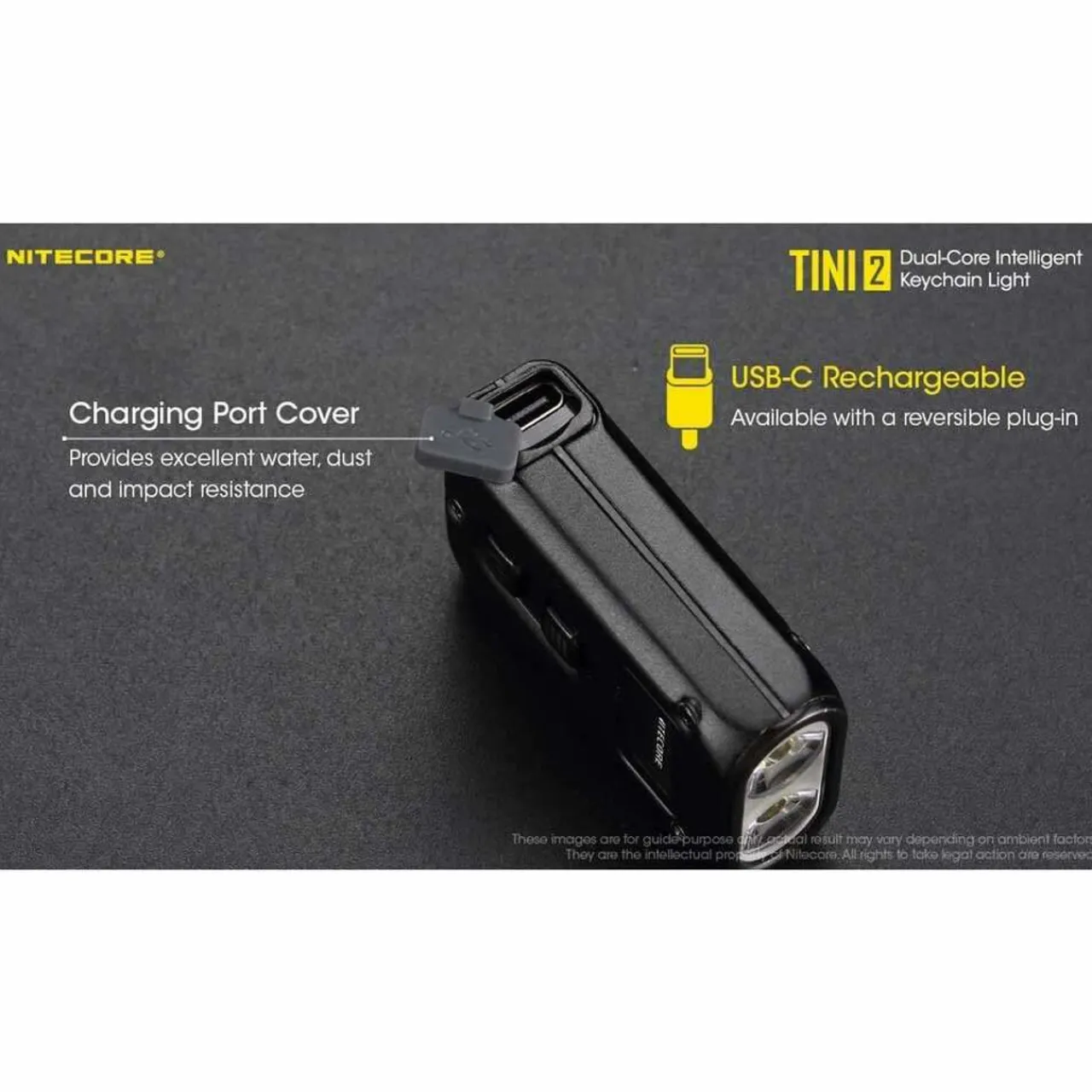 The Nitecore TINI 2 is an intelligent keyring light with an impressive maximum output of 500 lumens from the 2 x OSRAM P8 LEDs and is powered by a built-in 280mAh li-ion battery. The torch is rechargeable via a USB-C port at the head of the light for fast and convenient charging. Please note, a charging cable is not included. The Nitecore UAC-20 USB to USB-C charging cable can be purchased separately.