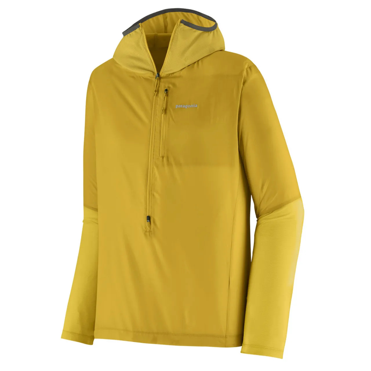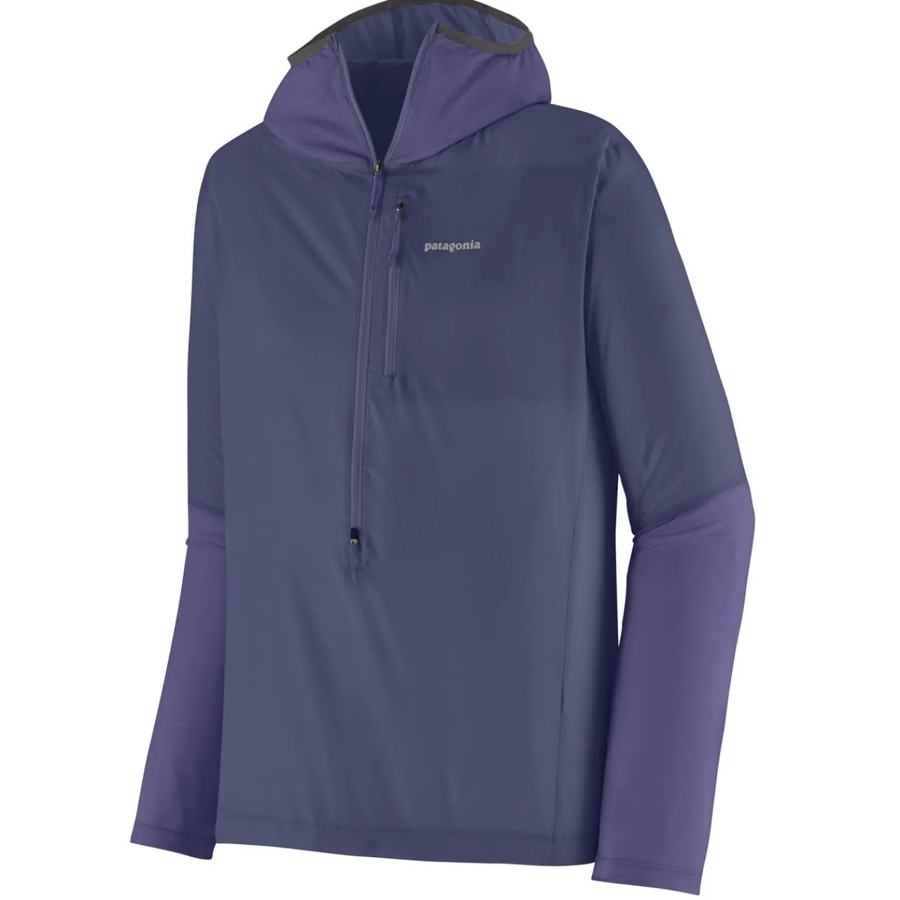 The Patagonia Airshed Pro Pullover is a lightweight, packable wind shirt with breathable fabric and a water-resistant finish. It features a stretch-knit hood and sleeves for comfort and a two-way zipper for ventilation.