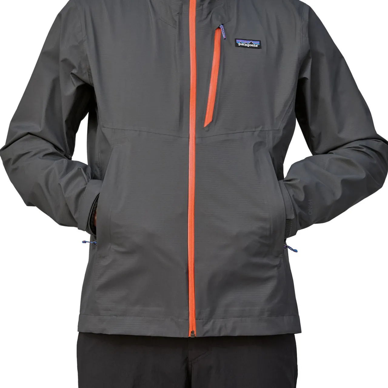 Zipper and Pocket Details - Center-front zipper and a chest pocket have watertight zips and zipper garages; two welted handwarmer pockets stay clear of a pack waistbelt or a harness