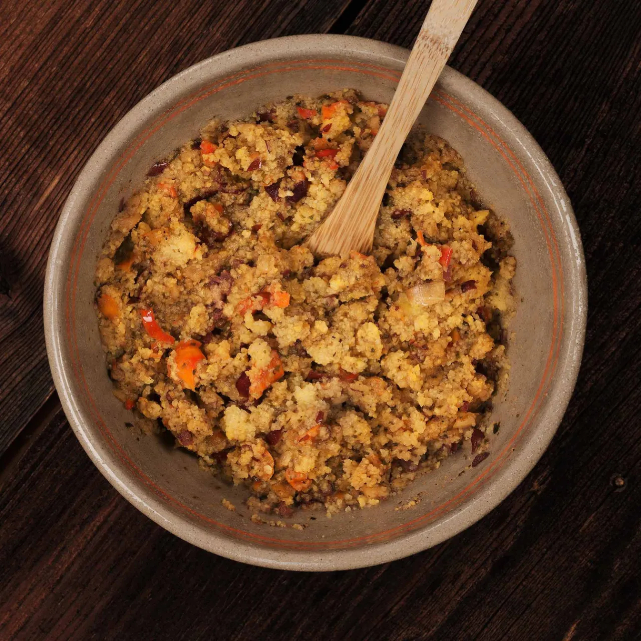 The taste is there, the meat is out. Vegan version of the classic chili con carne cooked only from organic ingredients. Full-bodied taste and aroma of chili, nutritious and filling beans, aromatic bell-pepper and olives, plus the cow is still alive.