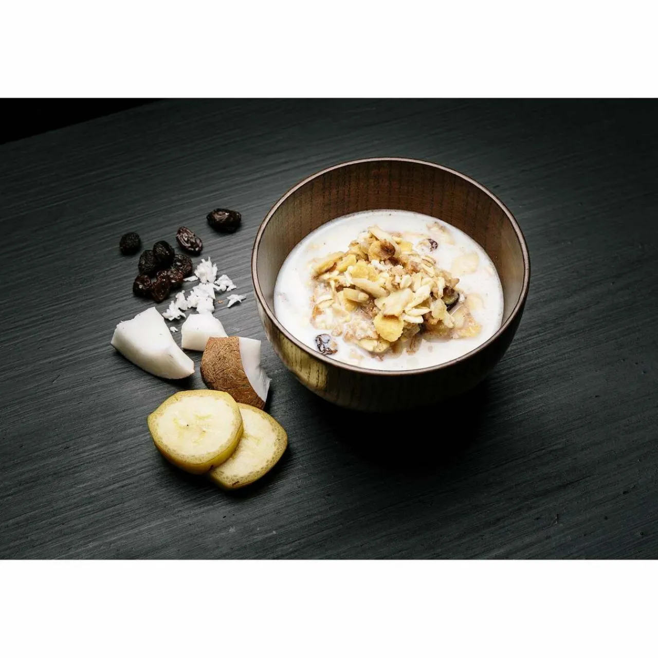 - Muesli (whole grain wheat, oats, raisins (15%), pineapple chunks (sugar, pineapple) (10%), corn flour, oat flour, sugar, salt, wheat malt) (54%), powdered milk, soy protein, sugar and cinnamon mixture (sugar, glazing agent (E551), rapeseed oil, cinnamon (10%), vanillin) (5,8%), banana chunks (banana, coconut oil, sugar, honey, aroma) (5,2%).