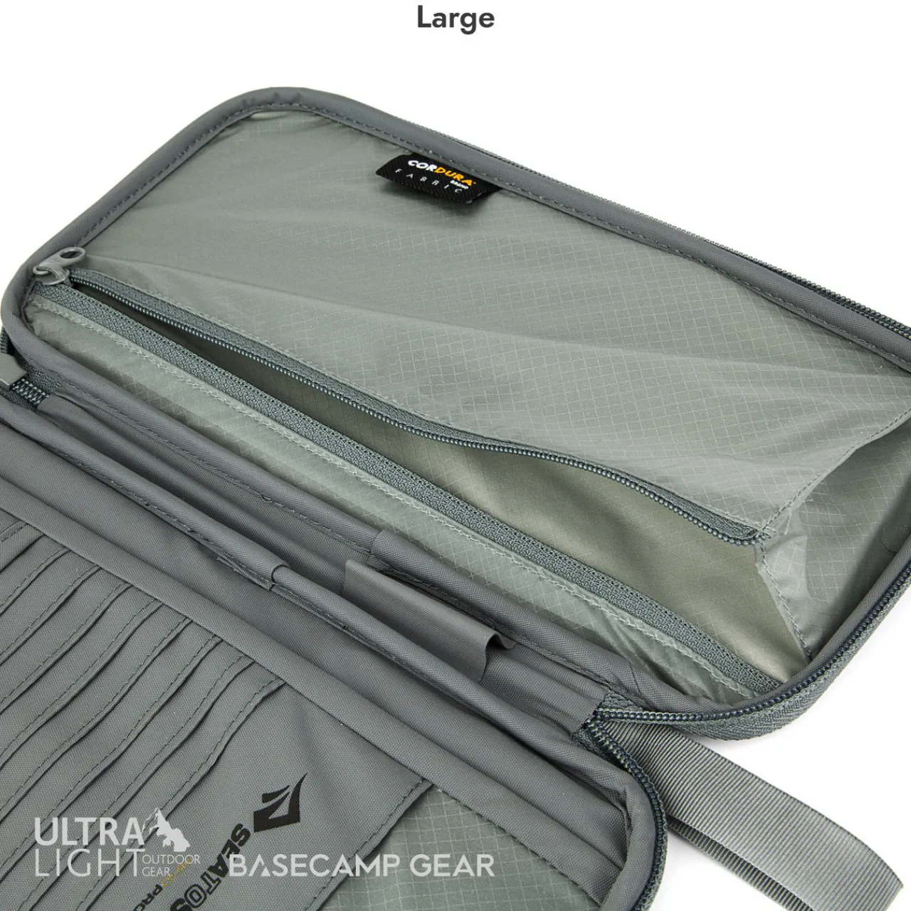 - Large: Eight credit card slots, two large sleeves, pen holder, zippered coin pouch and an external pocket for boarding