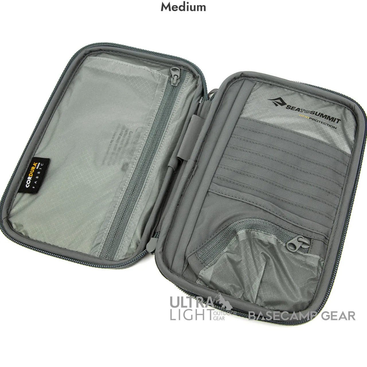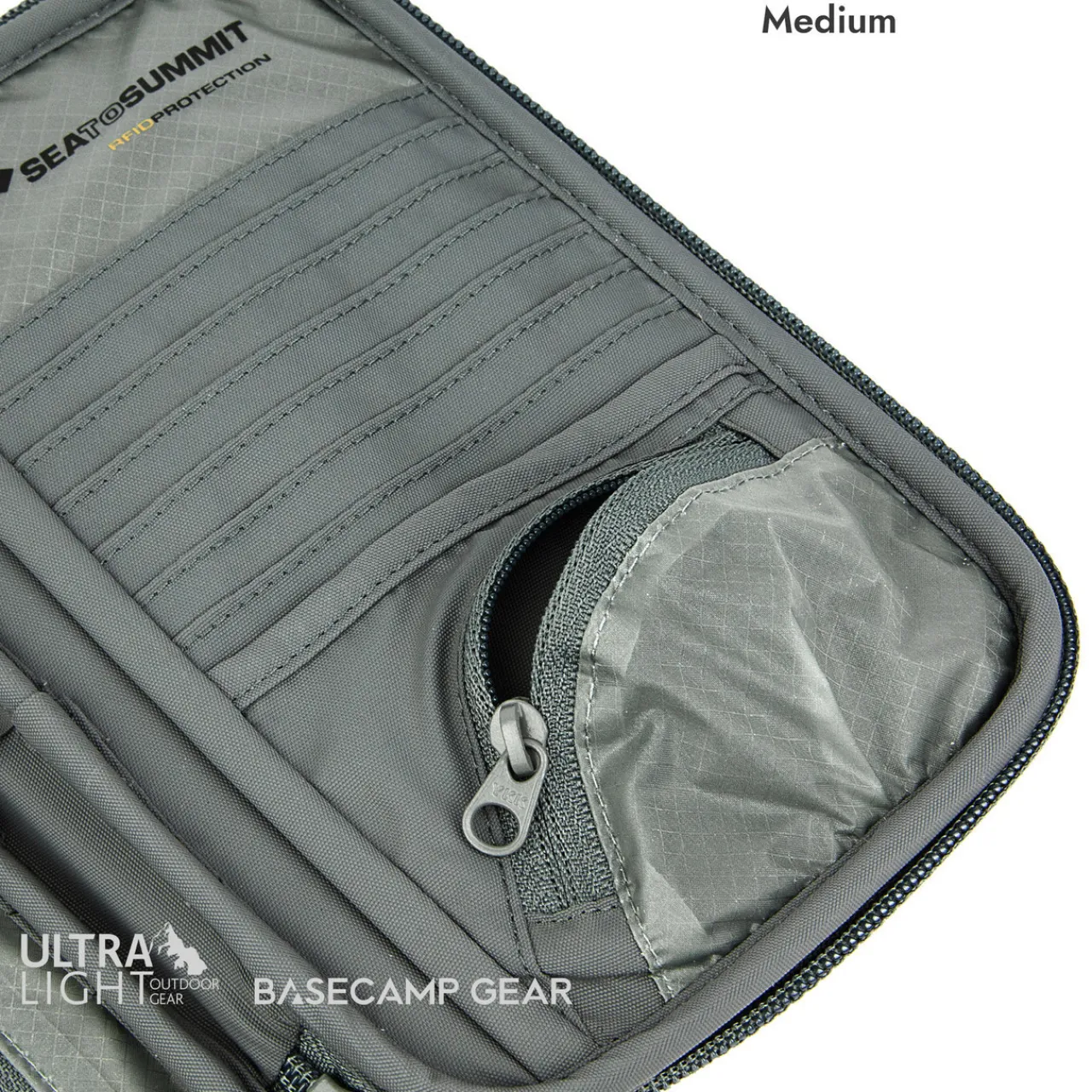- Medium: Seven credit card slots, two sleeves, pen holder, zippered coin pouch and an external pocket for boarding pass or itinerary—also fits a passport
