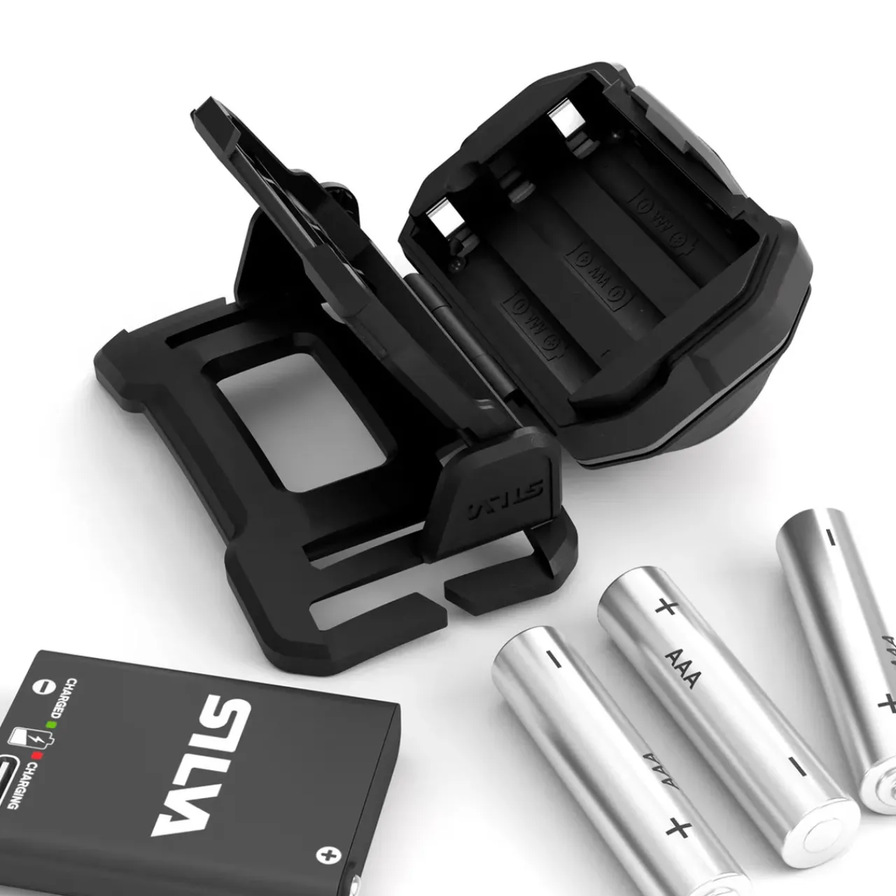 Both Discover headlamps feature Hybrid technology, meaning they are compatible with rechargeable Silva Hybrid Battery and AAA batteries. The Hybrid Battery is included in Discovery Hybrid. The headlamp also has a 4-level battery indicator.