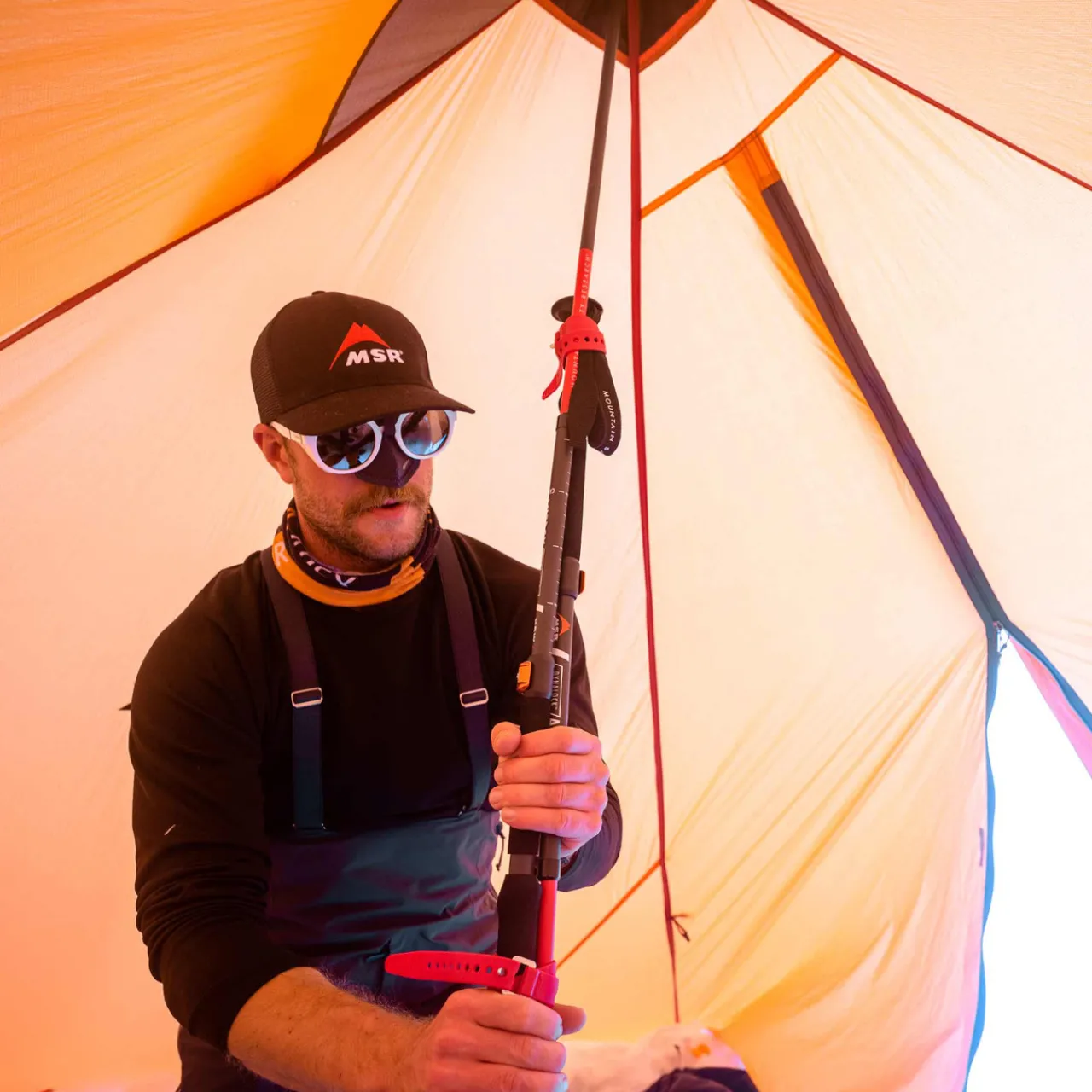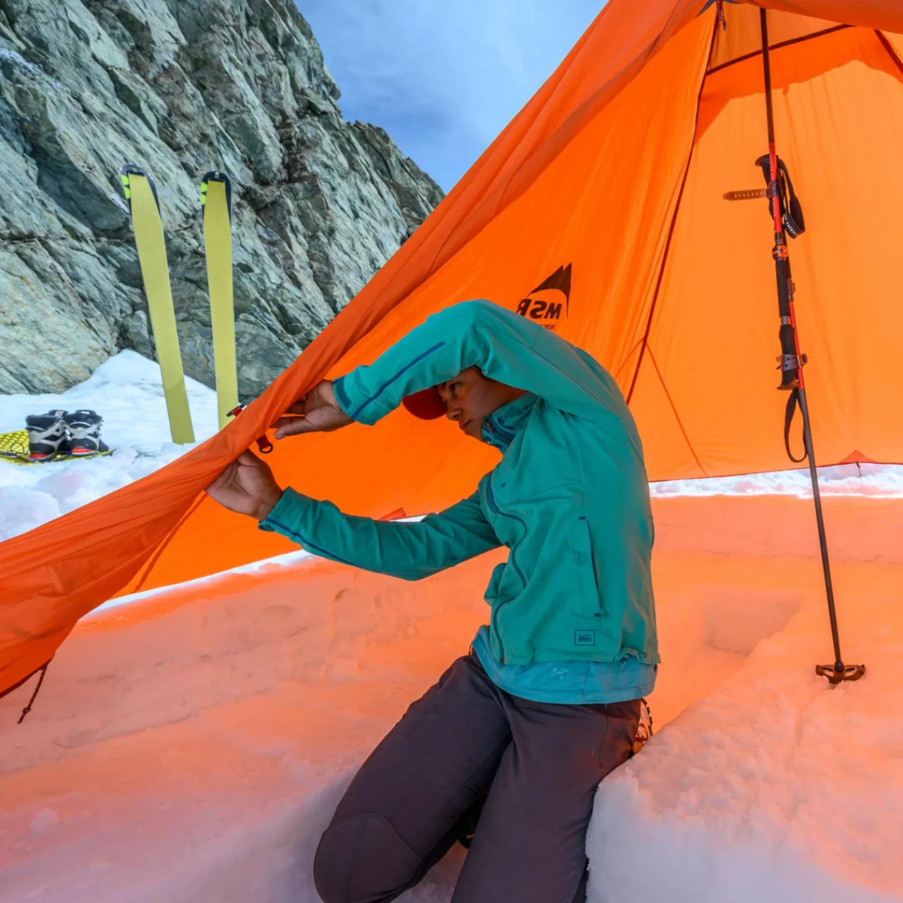 - Quick Setup: Frameless, floorless design pitches with ski/trekking poles or 5-foot accessory pole (sold separately); ski straps included for easy assembly. Easy Access: Zippered door rolls back completely on both sides for sweeping views and easy entry.