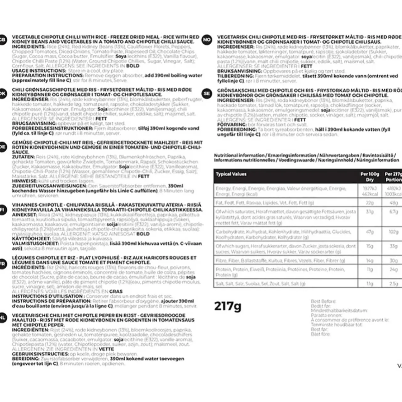 No matter what scenario you find yourself in during an adventure, preparing a warming and delicious meal couldn’t be simpler. Simply adding water to rehydrate the ingredients can give you a delicious vegetable chilli in less than 10 minutes.Â