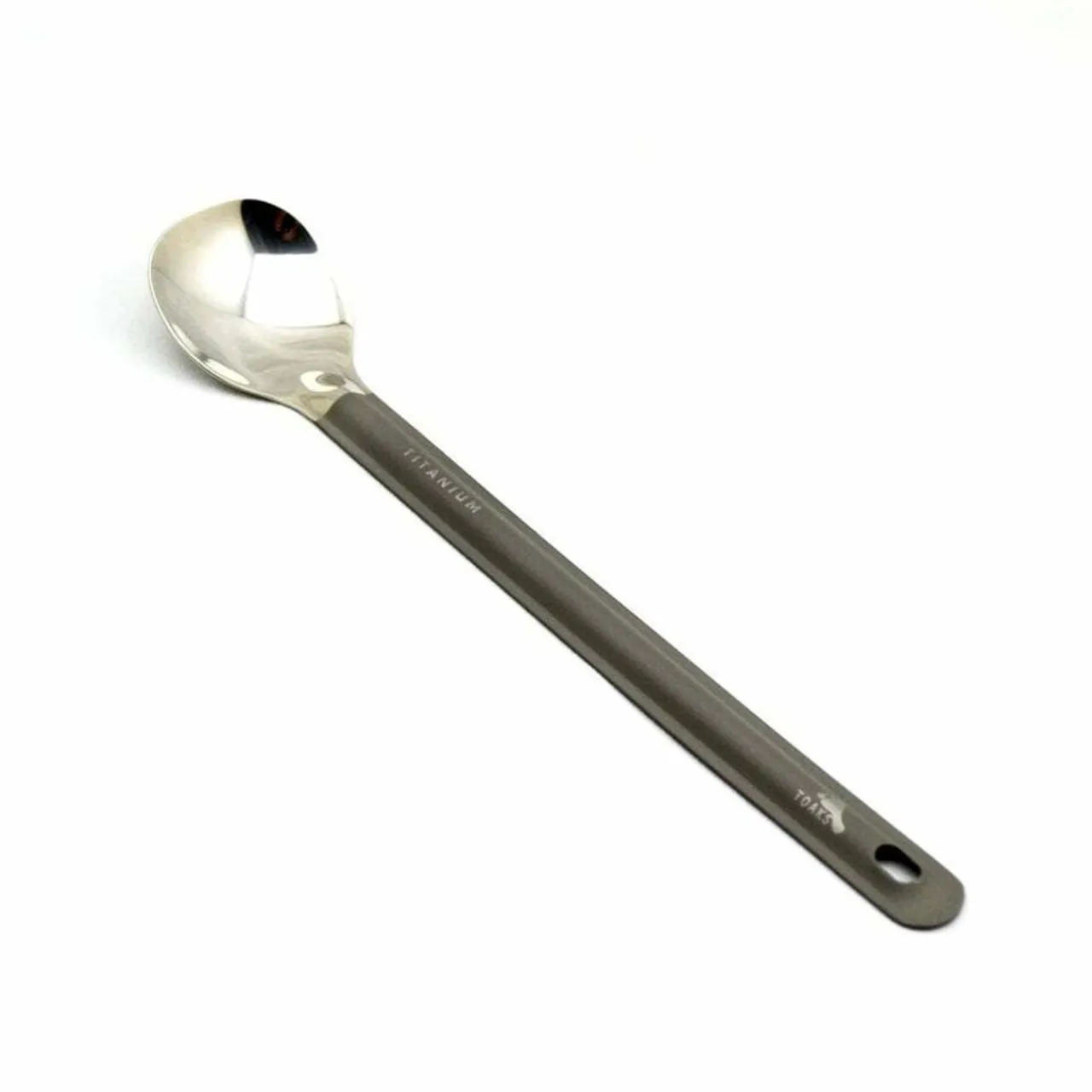 Lightweight titanium long handle spoon with polished bowl and matte finish handle.