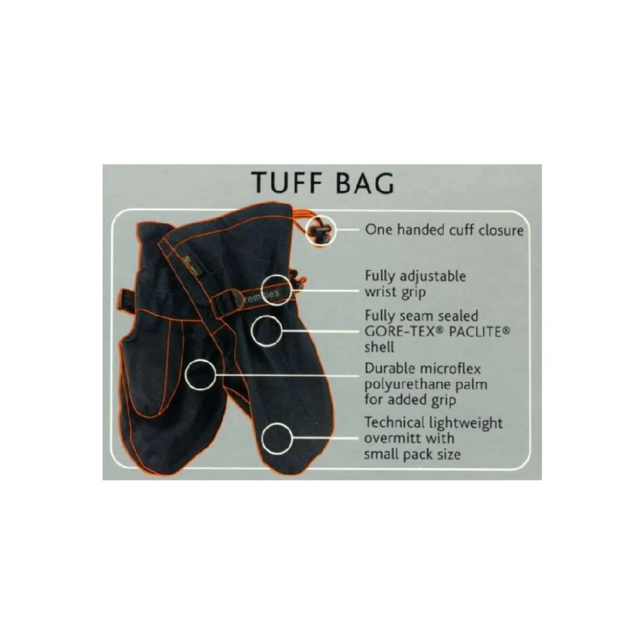Extremities says: Classic simple over-mitt with a durable Microflex PU palm and thumb providing extra grip and better abrasion resistance.