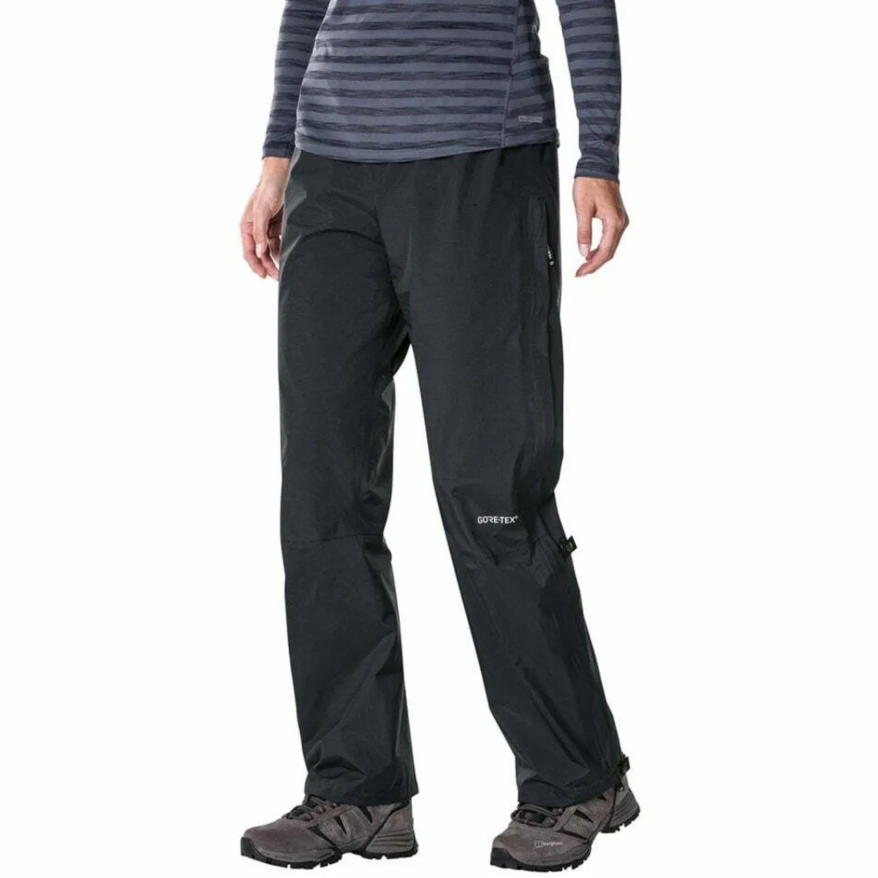 Women’s Paclite Gore-Tex Overtrousers from Berghaus provide very high levels of waterproof protection. The 3/4 length zips can be opened for venting when in use, you can open them up all the way down the pants and use the press stud at the ankle and halfway up to keep your legs still protected but very vented. The pants use a water resistant zipper and a storm flap over the top of that, if you’re battening down the hatches in these overtrousers there won’t be any ingress of water through the zip, that’s for sure.